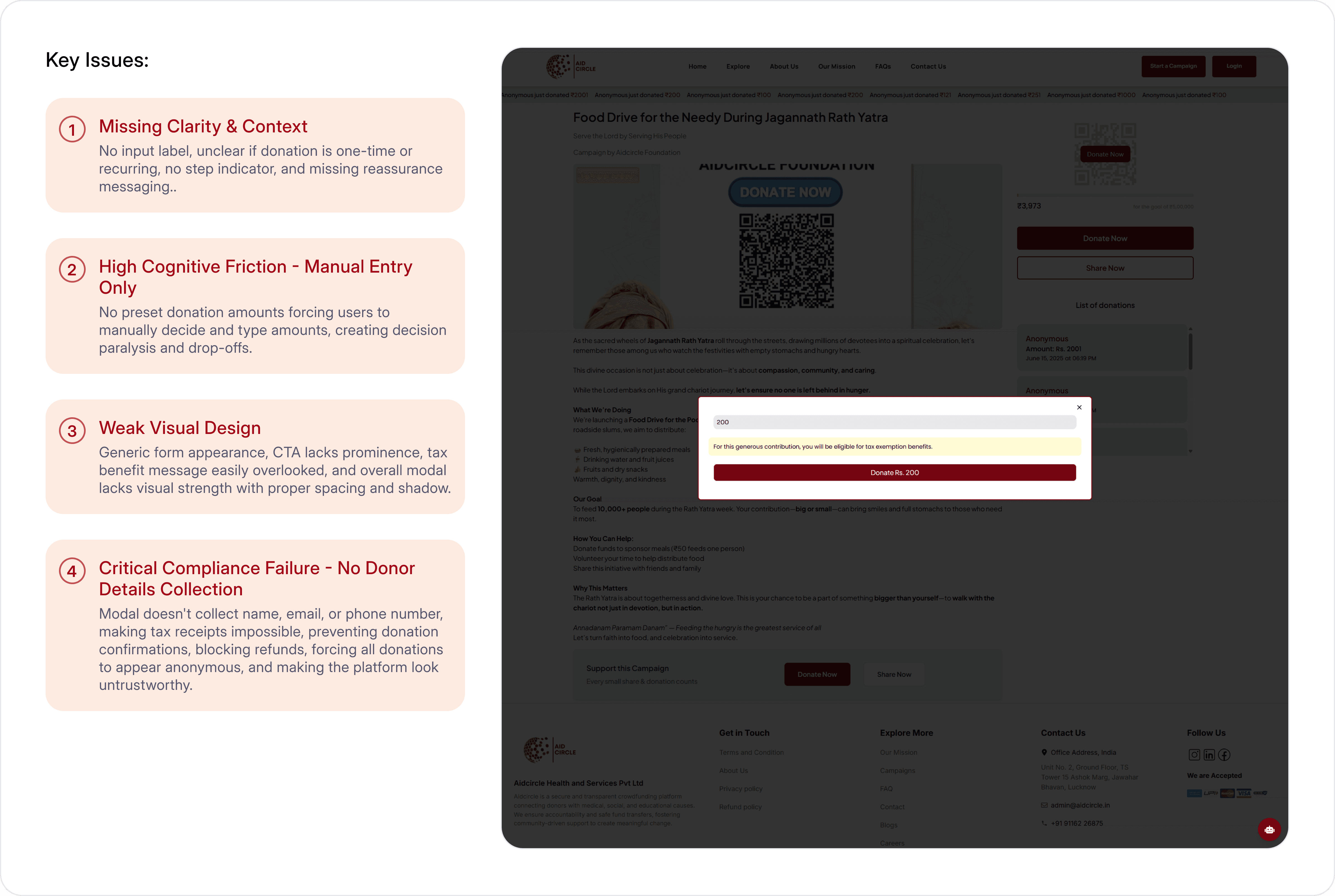 The donation step felt unclear and unsafe. It didn’t ask for donor details, didn’t offer anonymity options, and didn’t explain what happens next leading to hesitation and abandoned payments.