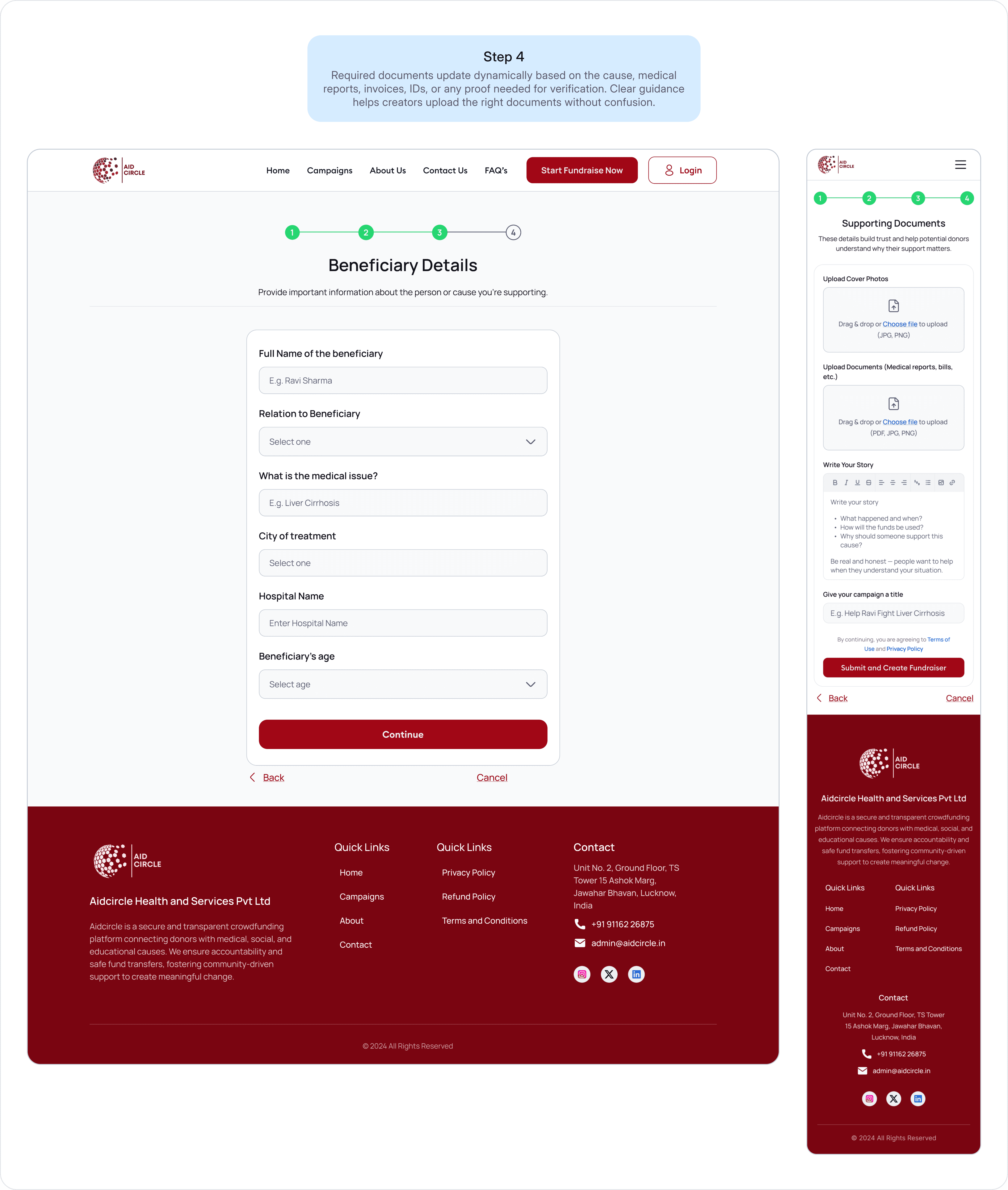Progressive Disclosure for Complex Processes Successful platforms break campaign creation into digestible steps. Ketto uses a 4-step flow, Milaap segments by campaign type first, and ImpactGuru surfaces document requirements early to reduce abandonment. We applied these patterns to reduce cognitive load while ensuring users understood requirements upfront.