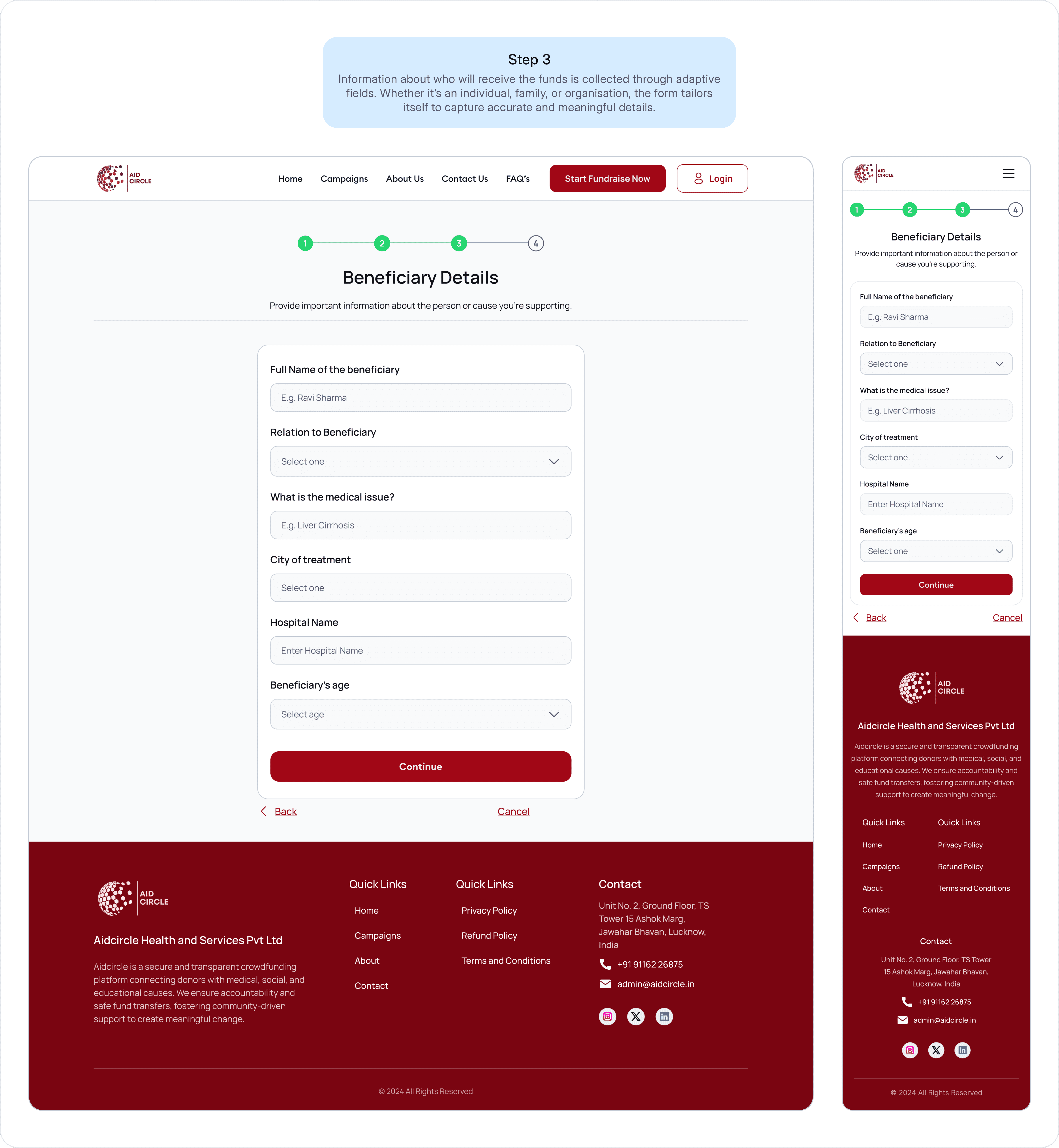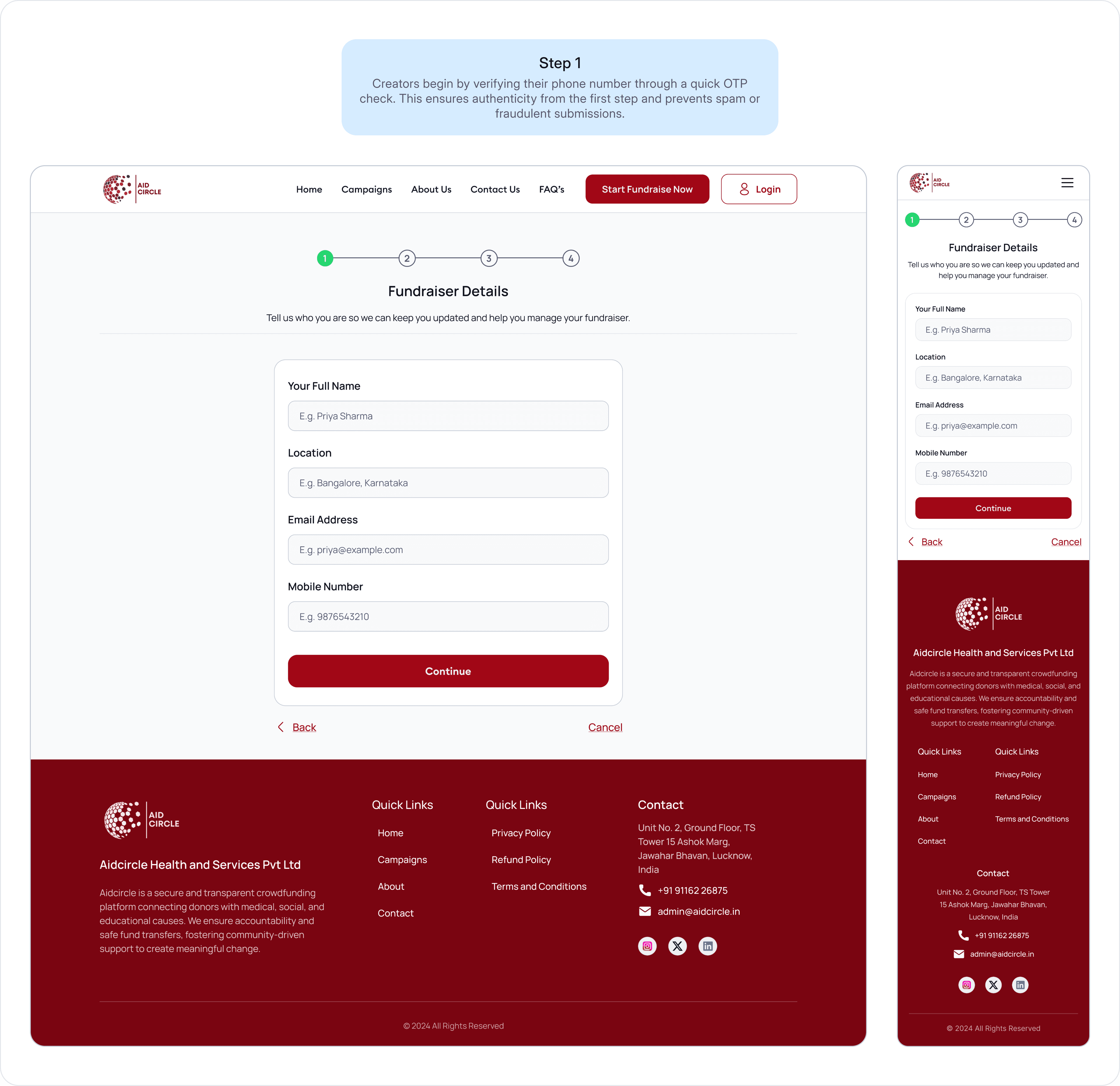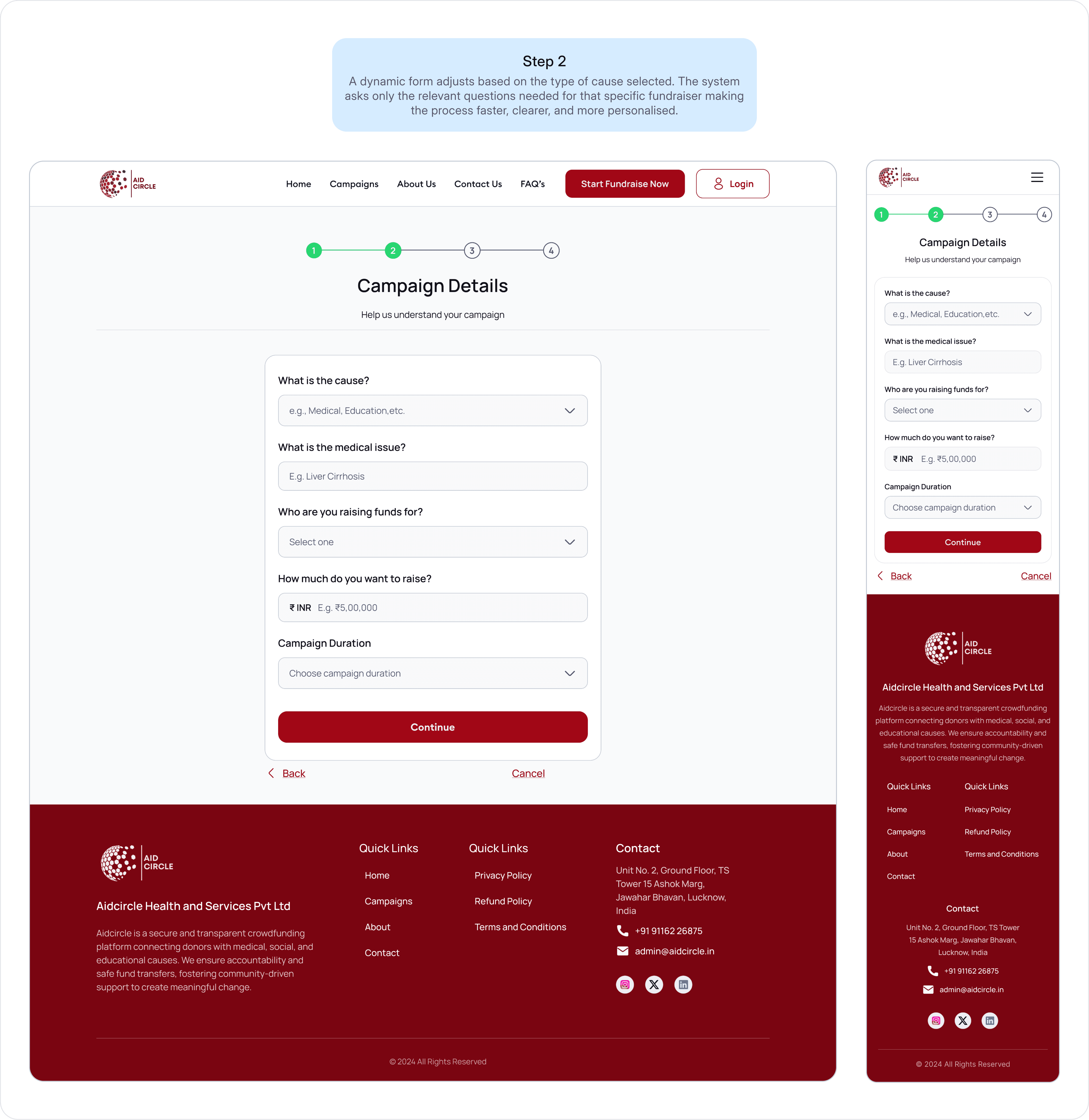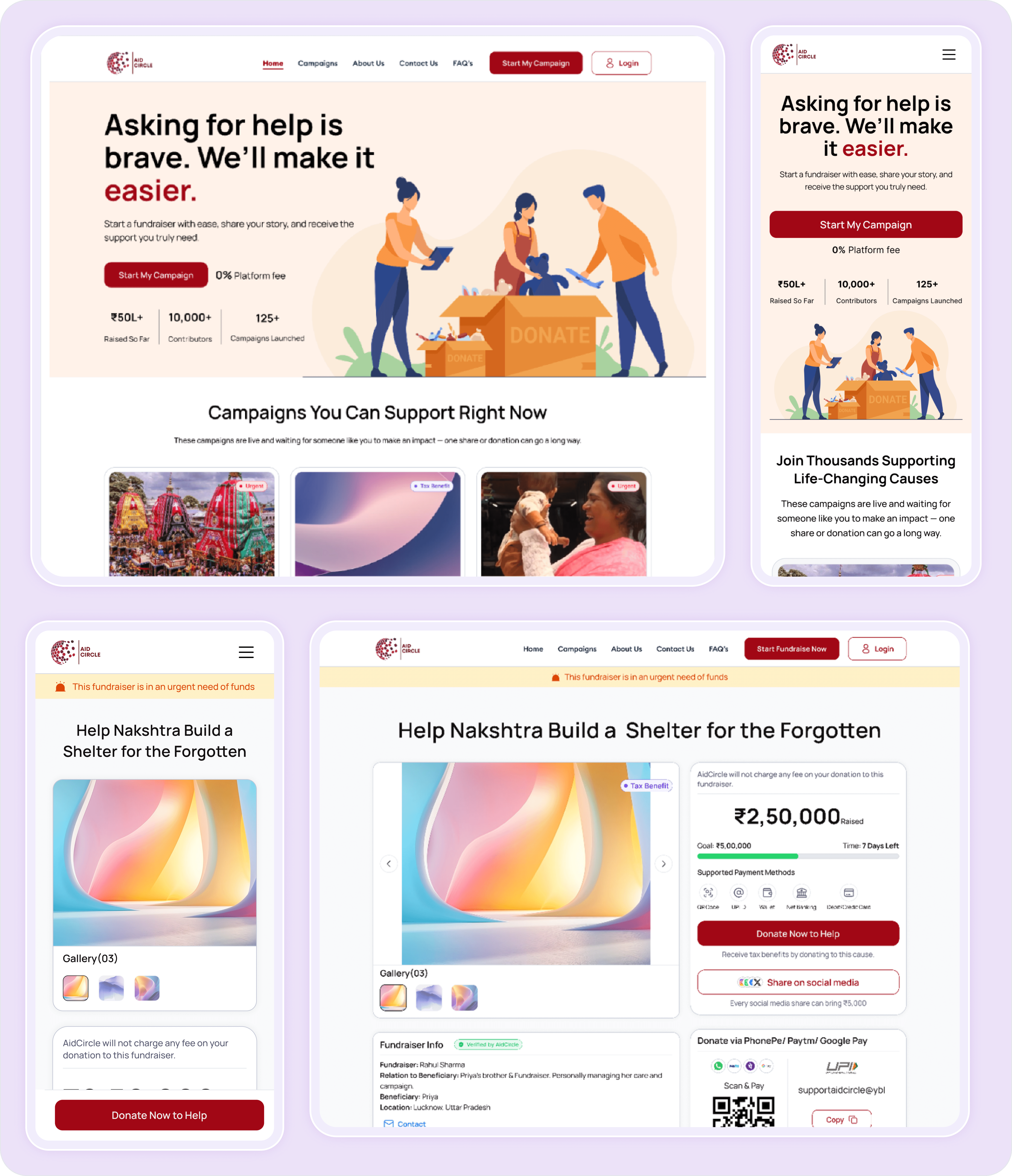 AidCircle is a crowdfunding platform helping people raise funds for medical emergencies, education, social causes, and more. In June 2025, they approached me to redesign their platform and create a self-service campaign creation system to replace their entirely manual process.
