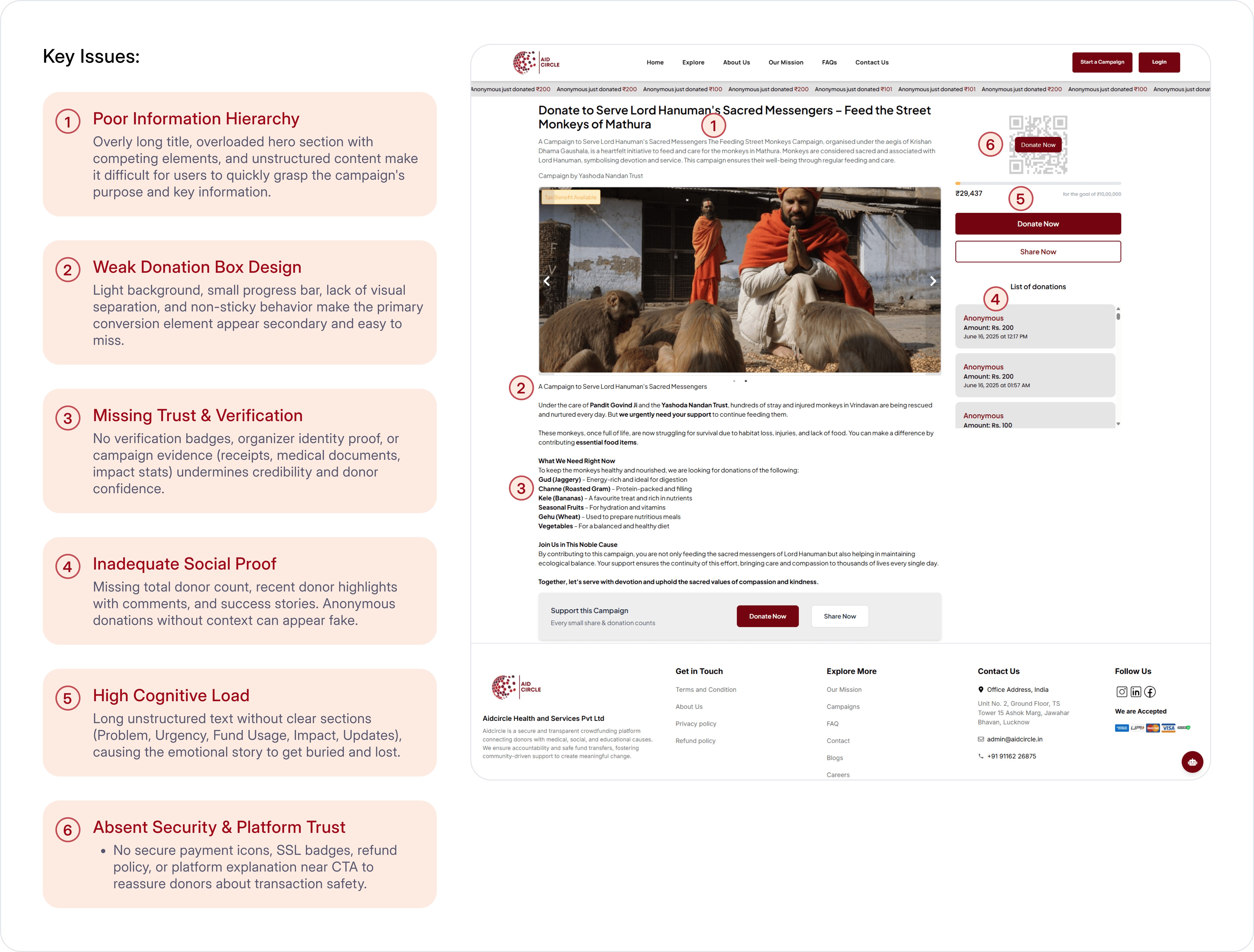 AidCircle approached me in June 2025 with a critical problem: their crowdfunding platform was receiving traffic, but conversions were disappointingly low. Visitors were browsing campaigns but hesitating to donate, and potential campaign creators were finding it difficult the process. Through stakeholder interviews and platform analysis, I identified the core issues: