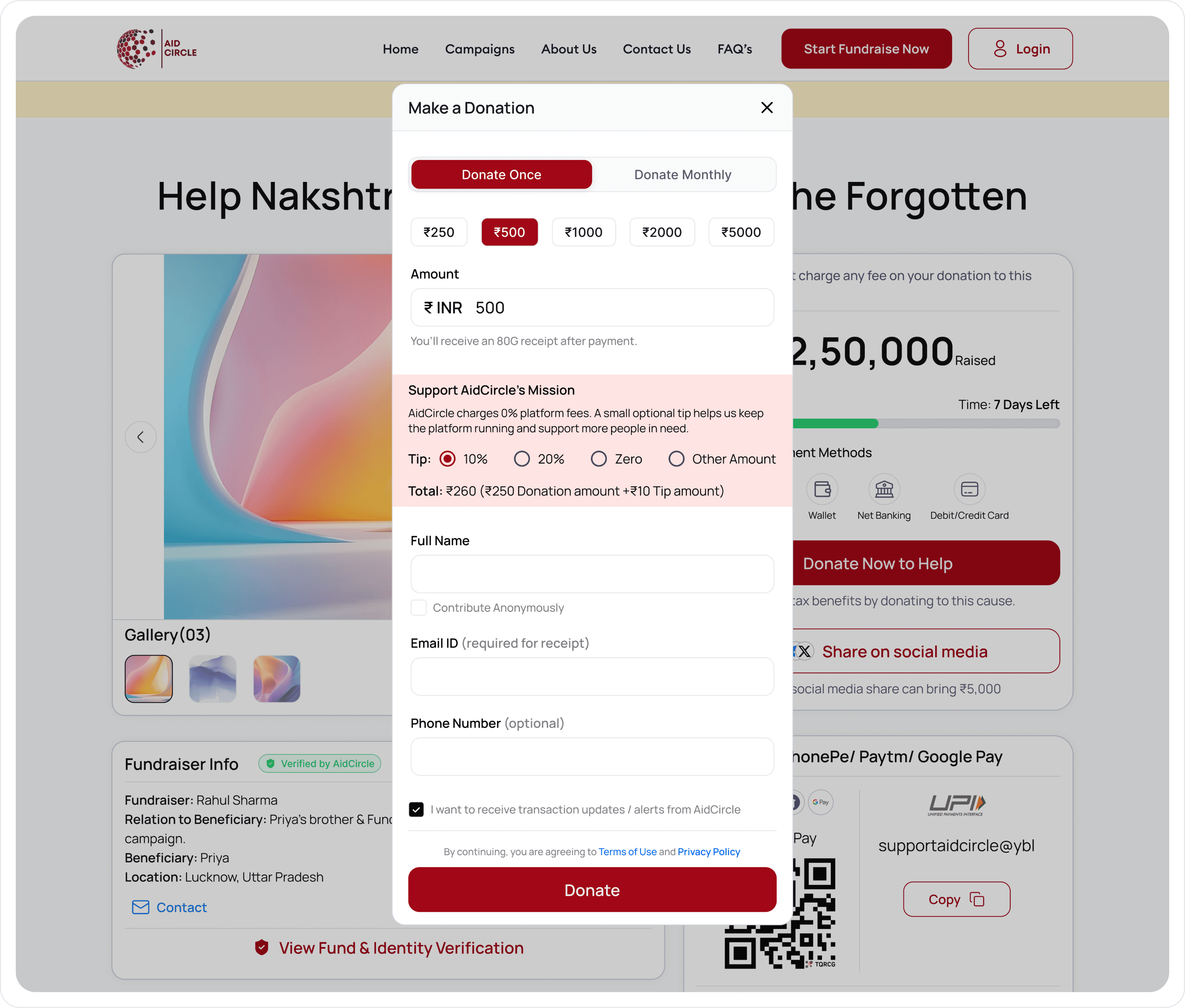The modal is now simple, transparent, and reassuring. Donors can share their details, stay anonymous, understand charges, and complete the payment with confidence.
