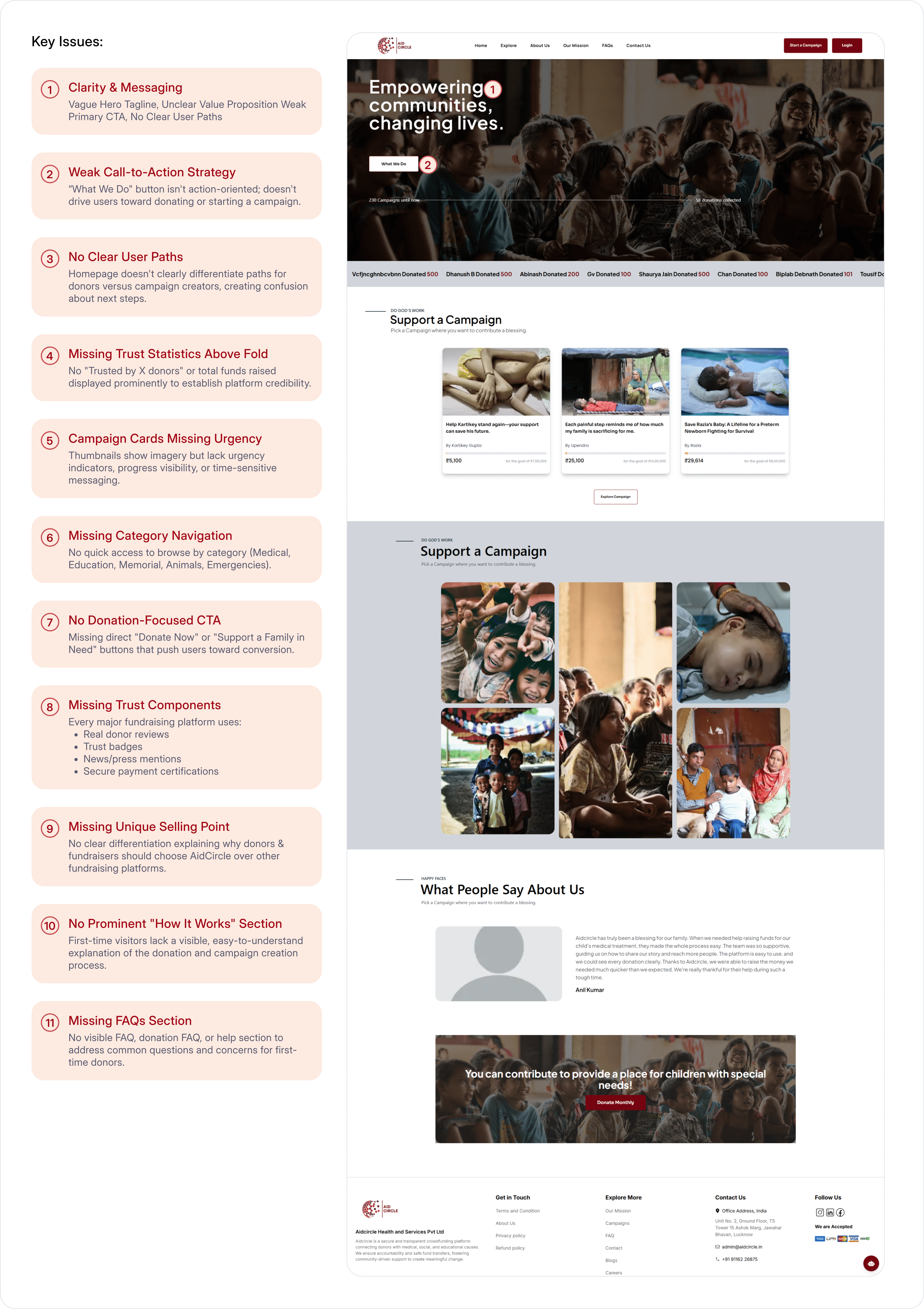 A comprehensive audit of AidCircle's existing platform revealed systemic issues across user experience, visual design, and information architecture.