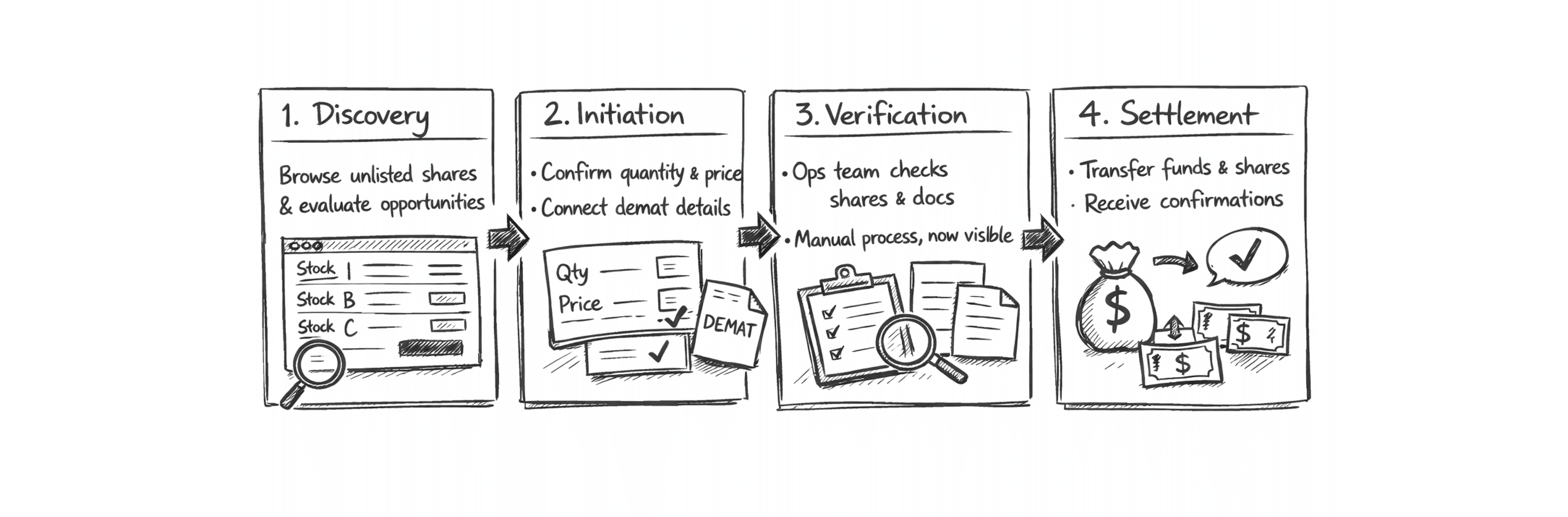 There's no "tap buy, money debits, shares appear" in unlisted trading. Each deal involves verification, document exchange, and delayed settlement. Designing a flow that felt structured and clear to the user while accommodating this complexity underneath was the core design challenge.