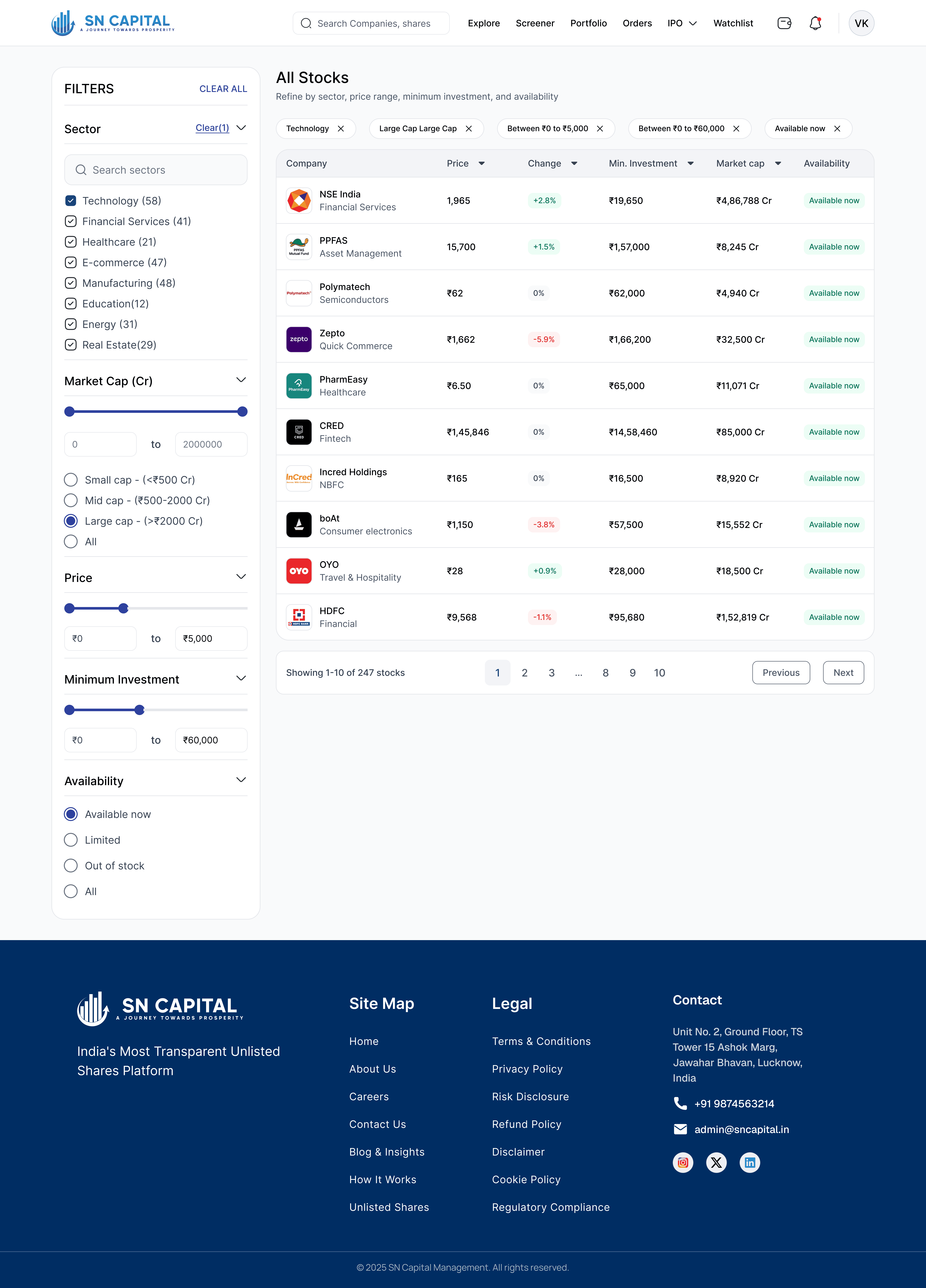 This project involved designing a digital platform for trading unlisted shares, ESOPs, and pre-IPO opportunities for SN Capital. The existing process relied heavily on manual coordination, making transactions slow, fragmented, and difficult to scale.